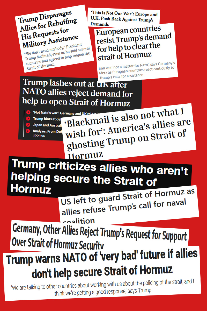 . . . mocking. bullying, threatening and pissing on countries that used to be friends and allies of the United States. But what a surprise! Now that he has stupidly blundered into a war with Iran, the most powerful country in the middle east (except for our puppets in Israel) he finds himself shocked, shocked to discover that he has bitten off way more than he can chew, and Iran has compromised the entire world economic system by choking off a fifth of the world’s oil supply. Of course our Celebrity Apprentice President first made sure to shut down all the clean renewable energy possibilities in the U.S.: Solar, wind, hydroelectric, geothermal, before poking the Persian snake by killing (as of today) 1,400 Iranians. Now he wants those former friends and allies to send their warships to the Strait of Hormuz to help him look like a victorious warlord, and he’s mad because they won’t do it.